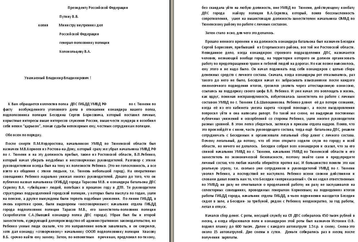 Почти полторы сотни инспекторов ГИБДД Тюмени подписались под письмом президенту РФ. Они обеспокоены ситуацией в ГИБДД УМВД России по городу Тюмени. Как подтвердили авторам в службе протокола администрации президента, письмо получено, факты будут проверены, ответ готовится в месячный срок. У письма тюменских сотрудников ГИБДД два адресата – вторая копия ушла на имя министра внутренних дел РФ генерал-полковника В.А. Колокольцева.